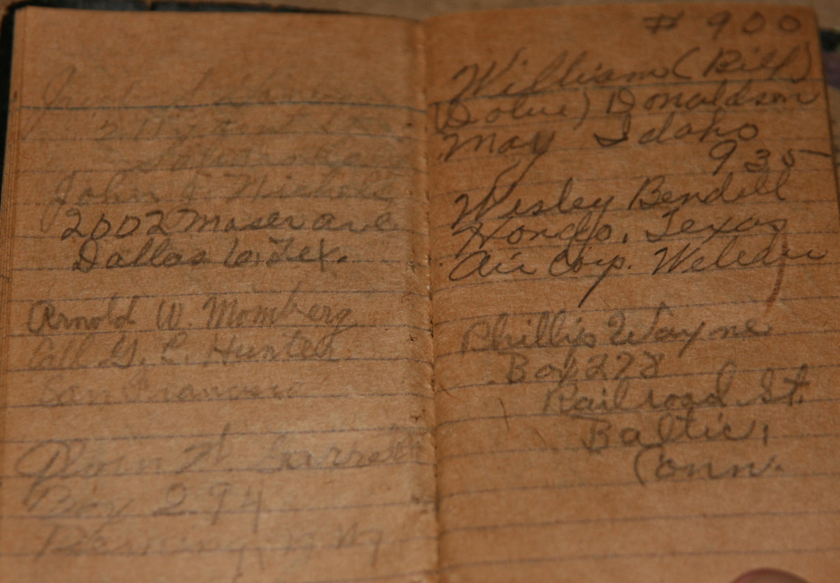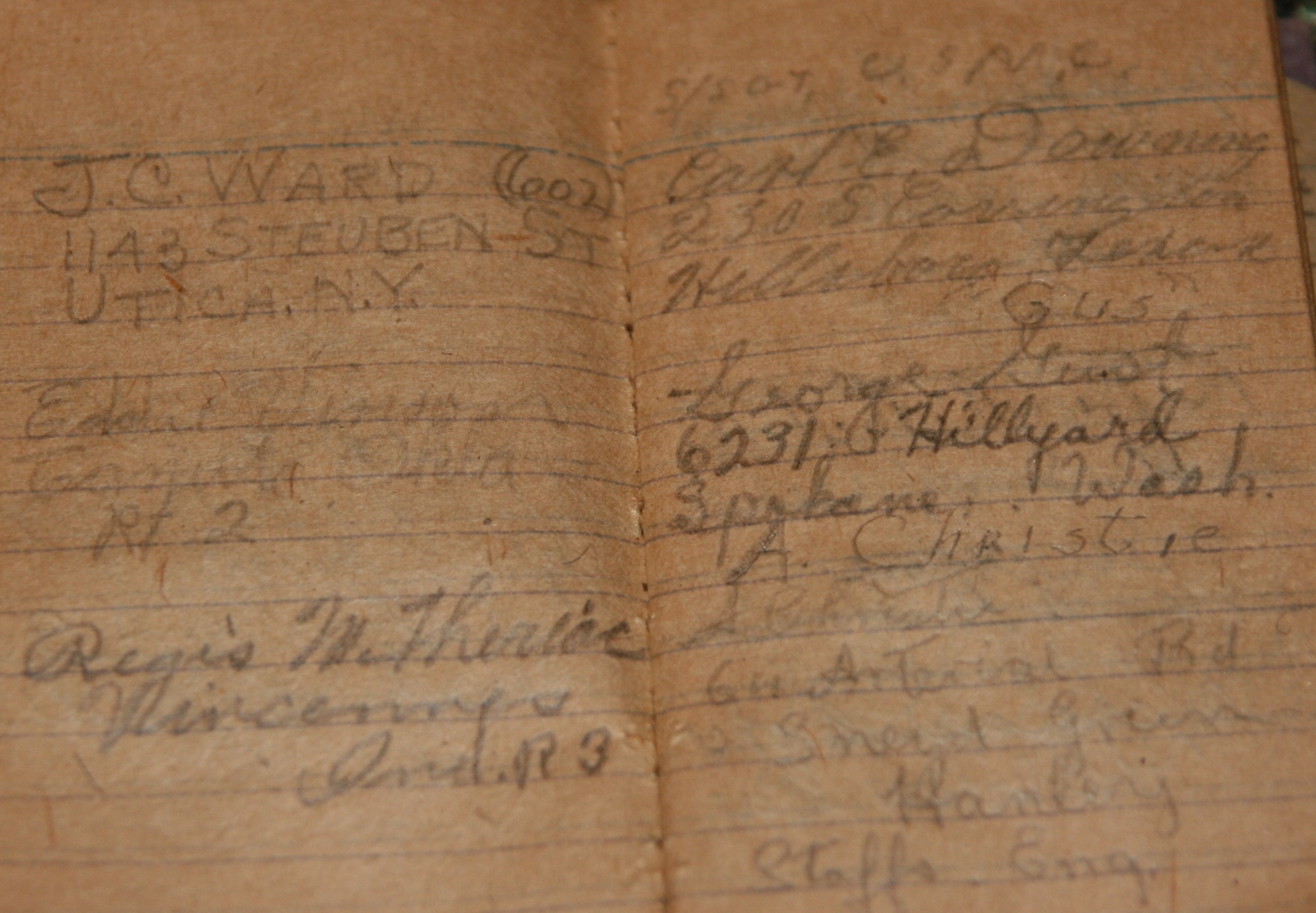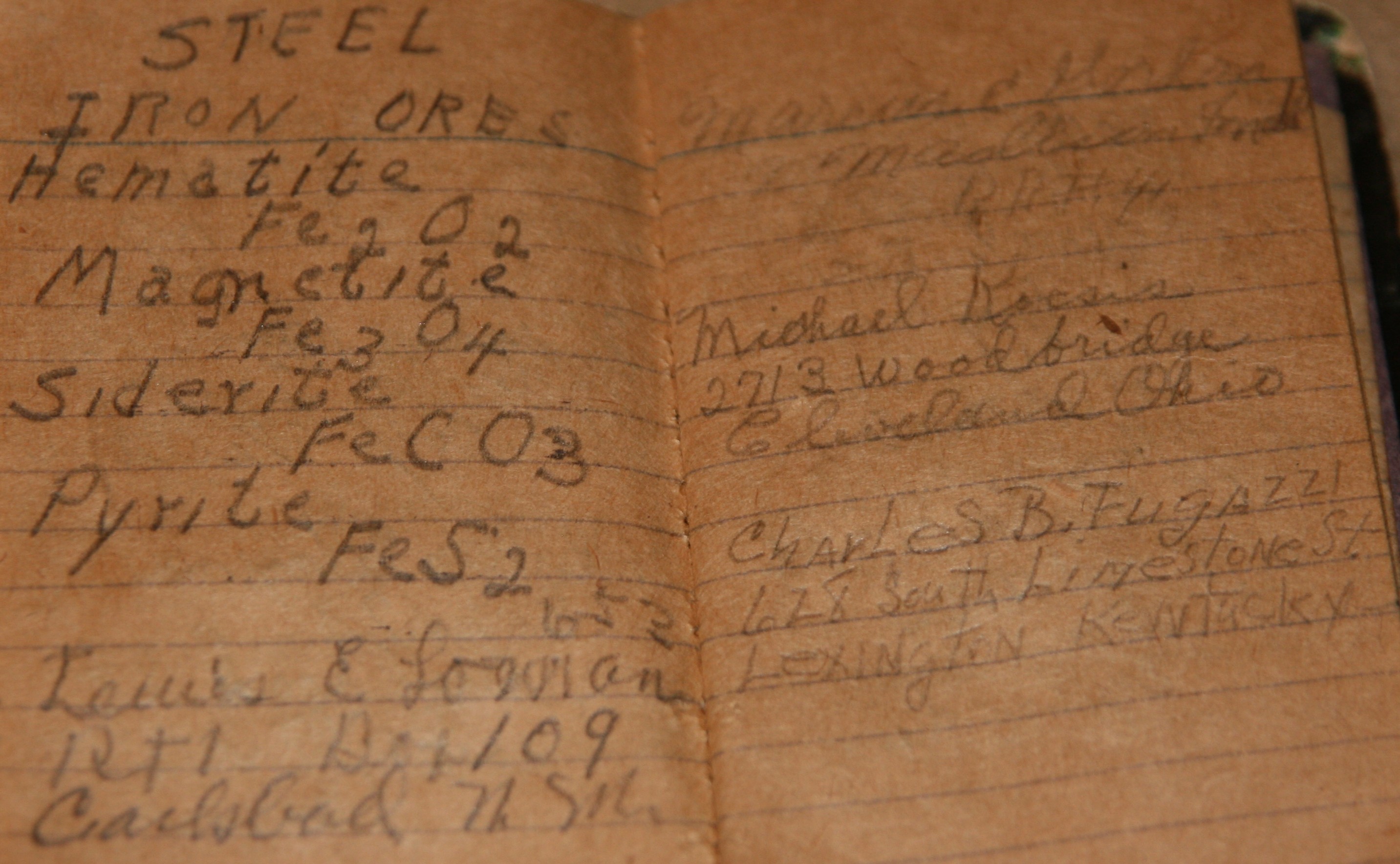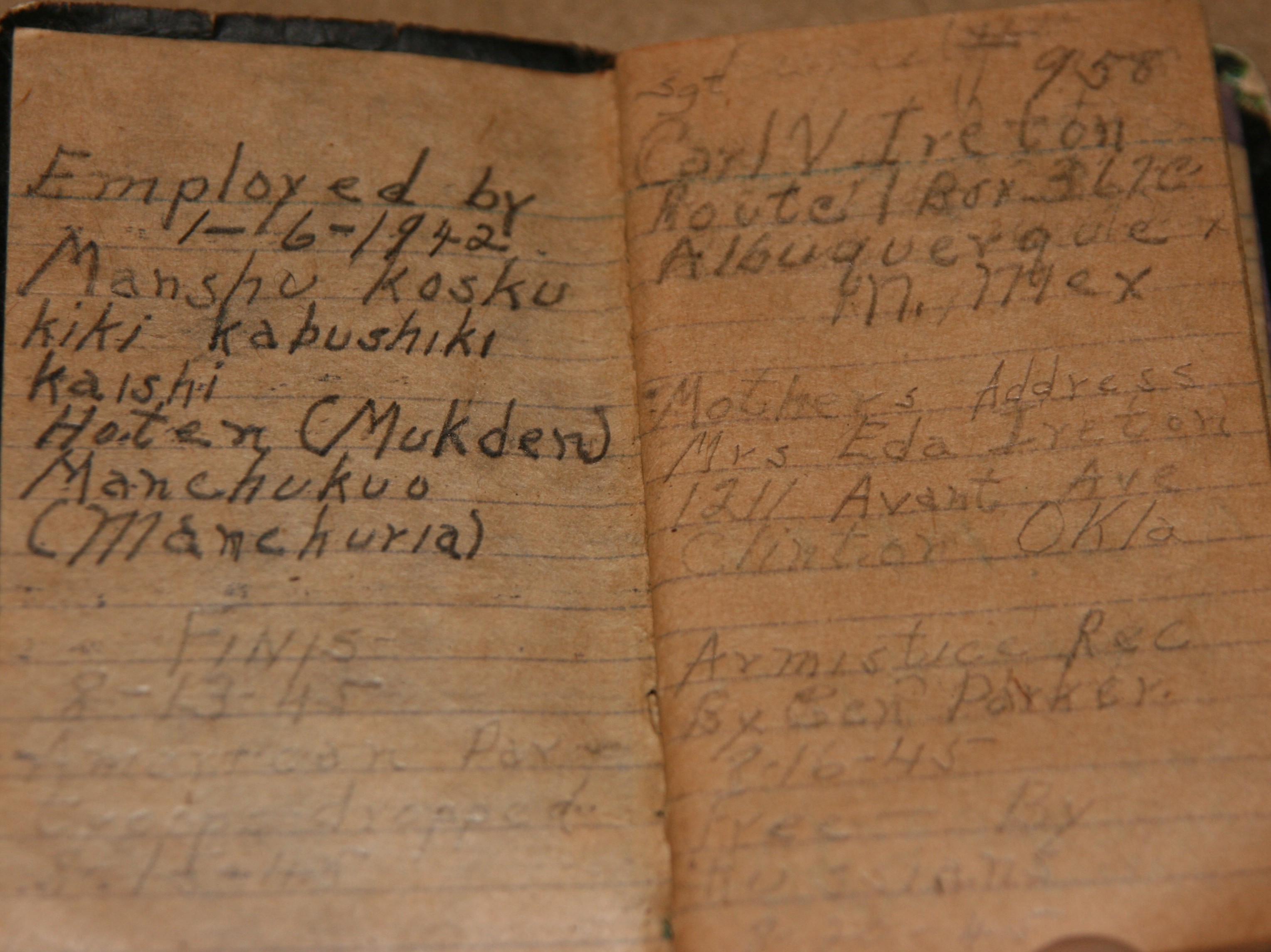 | Carl Vernon Ireton Notebook Employed by 1-6-1942 Manshu Kosku kiki kabushiki kaishi Hoten (Mukden) Mancukuo (Manchuria) Finis 8r-13-45 American Par-troops dropped 8-15-45 Sgt Carl V Ireton 958 Route 1 Box 367C Albuquerque N. Mex Mothers address Mrs Eda Ireton 1211 Avant Ave Clinton, Okla Armistice Rec By Gen Parker 8-16-45 Free - By Russians 8-20-45 Stephen D. Hutchison ? Ave Milton, Fla Jort? Fenton? Montana ? Allen Martin Fountain Colo Capt. Cash Skarda Clovis N. Mex Roy Weaver Ellesburg (Ellensburg?) Wash Herman Galloway 753 Boise Idaho Rt 5 Joseph A Burgess Rt. 1 Roanoke Texas Isaac W. Laughrun Rfd #1 (Speedy) Relief North Carolina James W Hand Fort Worth Rt 2 Box 95D Tex Ralph Middlebrook Tupelow Ark William Crebe (Grobe???) 820 Hickapoo Leavenworth Kan Address taken chemistry text book Ruth Albright c/o Canadian Academy Iray Cook Fort Benton Mont John R. Epps Rt. 1 Harviell Mo. Carl Herron Eads Colo Col. Charles Sage Deming N. Mex Capt Charlie Brown Deming N. Mex Henry L. Thomas Dustin Okal Capt(?) G. Peter Davies Meavgissey Vicarrage Cornwall, England Capt James McMinn Carlsbad N. Mex J. W. Donaldson, Capt Deming N. Mex Lt. Maynard B. Booth Ridgeview, S. Dak "Misery" James C. Cox Stockbridge Ga Leroy C. Layton Highland Ranch Star Route 2 Tomahawk, Wis "Cowboy" H.B. Greenleaf Billings, Mont Kenneth Mattern Klingerstown Penn Col. Harry M. Peck 514 W. Fruit Albuquerque Alvin A. Winnekens R.R. 1 Denmark, Wisconsin Earl Monroe Davis Boone, Colo Warren Mundell 5-11 First ave north (Wash Hillerd (Spokane) c/o Great Northern R.R. Carl M Long Mackinaw Ill RR #1 JA Scott Shell CO Perth Western Australia Air Corps CJ King 17605 Kentucky ave Detroit Mich Tel UN 24435 Floyd Marshall Russiaville Ind Ross E Newkirk R2 Box 16 Hanford, Calif Homer E. Vinger Dove Creek, Colo Jacob S Gamboa 211 Front St Salinas Calif John J. Nichols 2002 Maser Ave Dallas Tex Arnold W. Momberg Call GC Hunter San Fransisco Alvin W. Garrett Box 294 Deming NM #900 William (Bill) (Dolue) Donaldson May Idaho 935 Wesley Bendele Hondo, Texas Air Corp Weledu(?) Phillip Wayne Box 278 Railroad St Baltic Conn STEEL Iron Ores Hematite Fe2O2 Magnetite Fe3O4 Siderite FeCO3 Pyrite FeS2 653 Lewis E Loman Rt. 1 Box 109 Carlsbad NM Marcus C. Gordon Madison Ind(?) RR #4 Michael (Mitchell #1384?) Kocsis 2713 Woodbridge Cleveland Ohio Charles B. Fugazzi 628 South Limestone St Lexington Kentucky 836014 CPL(?) R. Sharpe c/o Officer Yc Records Royal Engineers Chatham Kent England G(?) Thompson 15 Higinson St Preston Lancs England H Mason 30 Hawksley St Horwich Bolton Lancs England (Dutch) Albert Burkert 803 Engrs U.S. Army A.B.O. Washington D.C. J.C. Ward (602) 1143 Steuben St Utica N.Y. Eddie Vinson Canute Okla Rt 2 Regis W. Theriac Vincennes Ind R3 S/Sgt U.S.M.C. Carl E Downing 2305 Covington Hillsboro Texas "Gus" George Gust 6231 Hillyard Spokane, Wash A. Christie 64 Arterial Rd Sneyd Green Hanley Staffs Eng ? Harrison ? VIA Balranald NSW Aust Major R.B. Hope(???) Col. Survey Service Singapore Nicholas Rohs Hilltown, PA Dorothy L. Robbins 601 49 Madison St Koanoke Rapids N.C. Bruce D. Cramer Manville Wyo c/o Mrs. Mario Houchin Frank J. Lucas 4 Berlin St Binghamton NY Ronald Joy 5 Greenmount St Beeston Leeds 11 Yorkshire England David K. Phillips Erick Oklahoma RR #1 Henry Earl Hoegerl Box 15 Violet Texas J.D. Scott 773 Leonard St Spartanburg S.C. Mark Thompson 37 Mikasa Street Walney Island Barrow-in-Furness Lancashire, England Joesph A. Vater 1462 Steuben St Pittlsburgh, Pa T.E. Aronds 2nd Lieutenant War Department Bandoeng Java Dutch East Indies Roy E. Creceey (Creecey?) Willow Creek Mont Lt. H.E. Wad 12 Clonbrock Stoke Newington London N16 England Walter S. Hurley 1st Sgt U.S. Army "Doc" Mark G. Herbst 431 S. McKinley Canton, Ohio Wm. W.M. Hewgley 123 Walton Ave San Antonio, Texas Ser. No. 6251383 Lt. L.B. Stiles c/o U.S. Forest Service Albuquerque N. Mex Ernest Montoya 2700 So. Williams Albuquerque N. Mex William B. Lagare 214 Spring St. Charleston S.C. August G. Rucker Hogan Ave Gresham Ore Dick Nunn Hillsboro, N. Mex Mrs. Roy Wilkens sister Allen Wright Sulpher Okla |