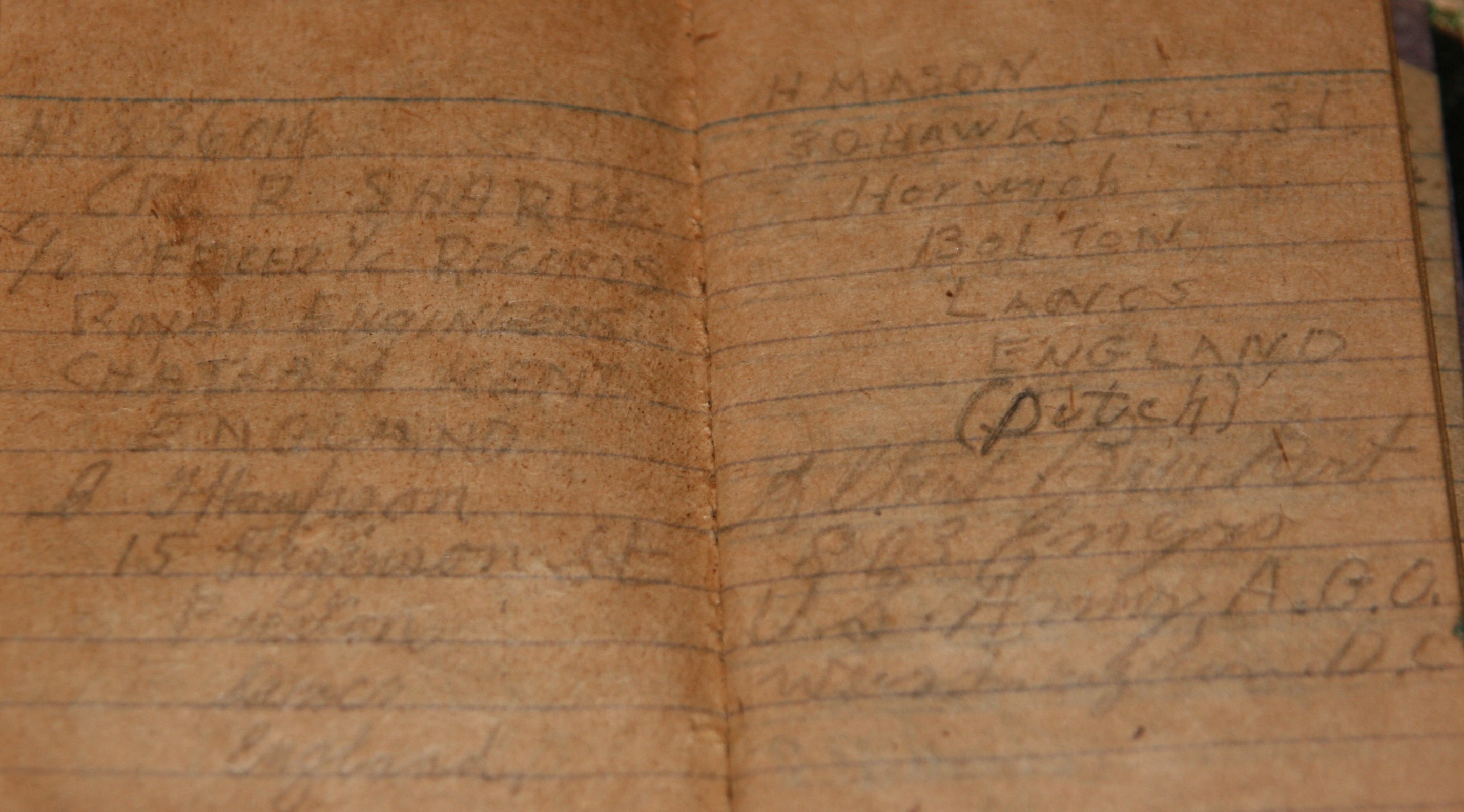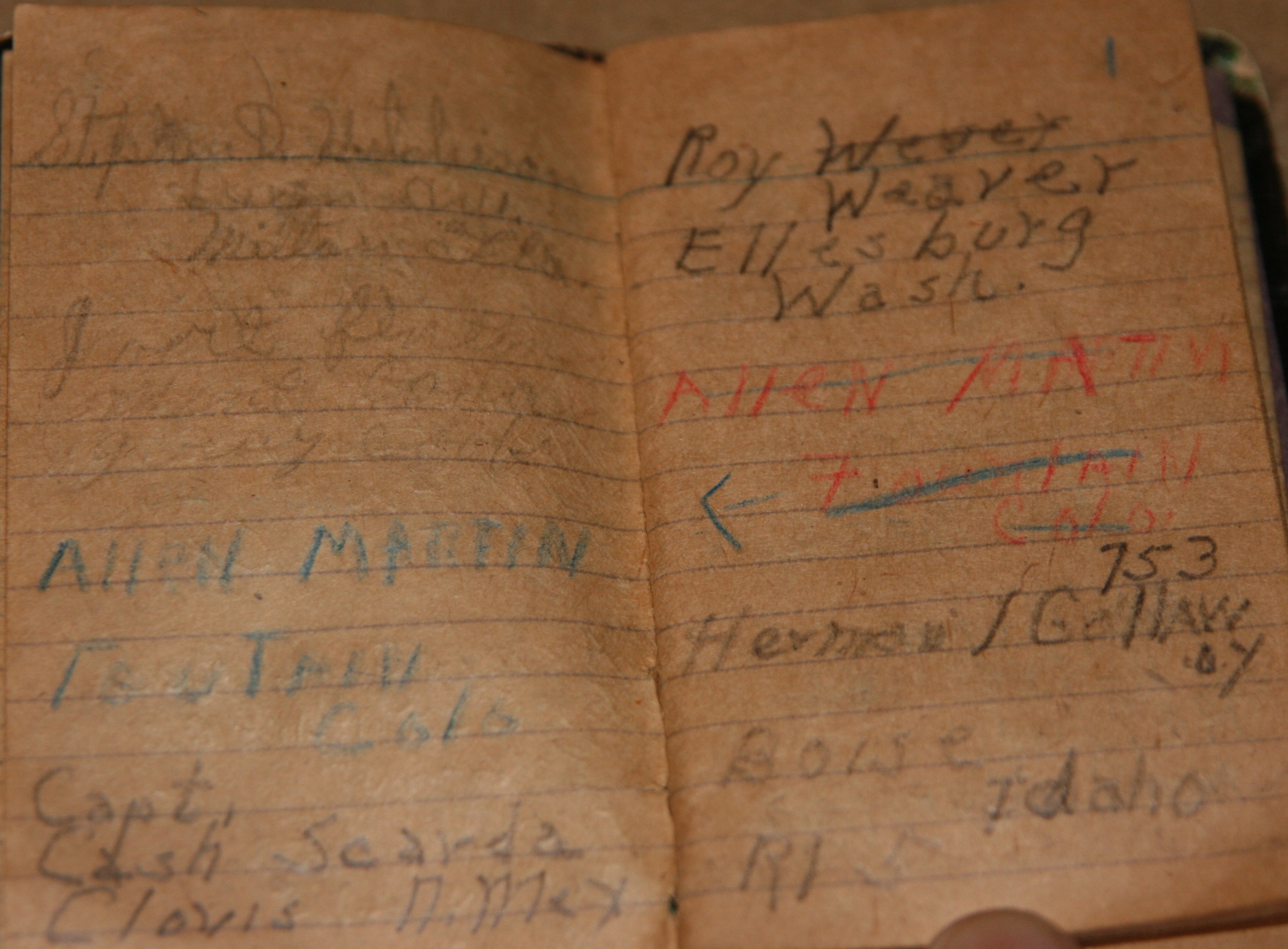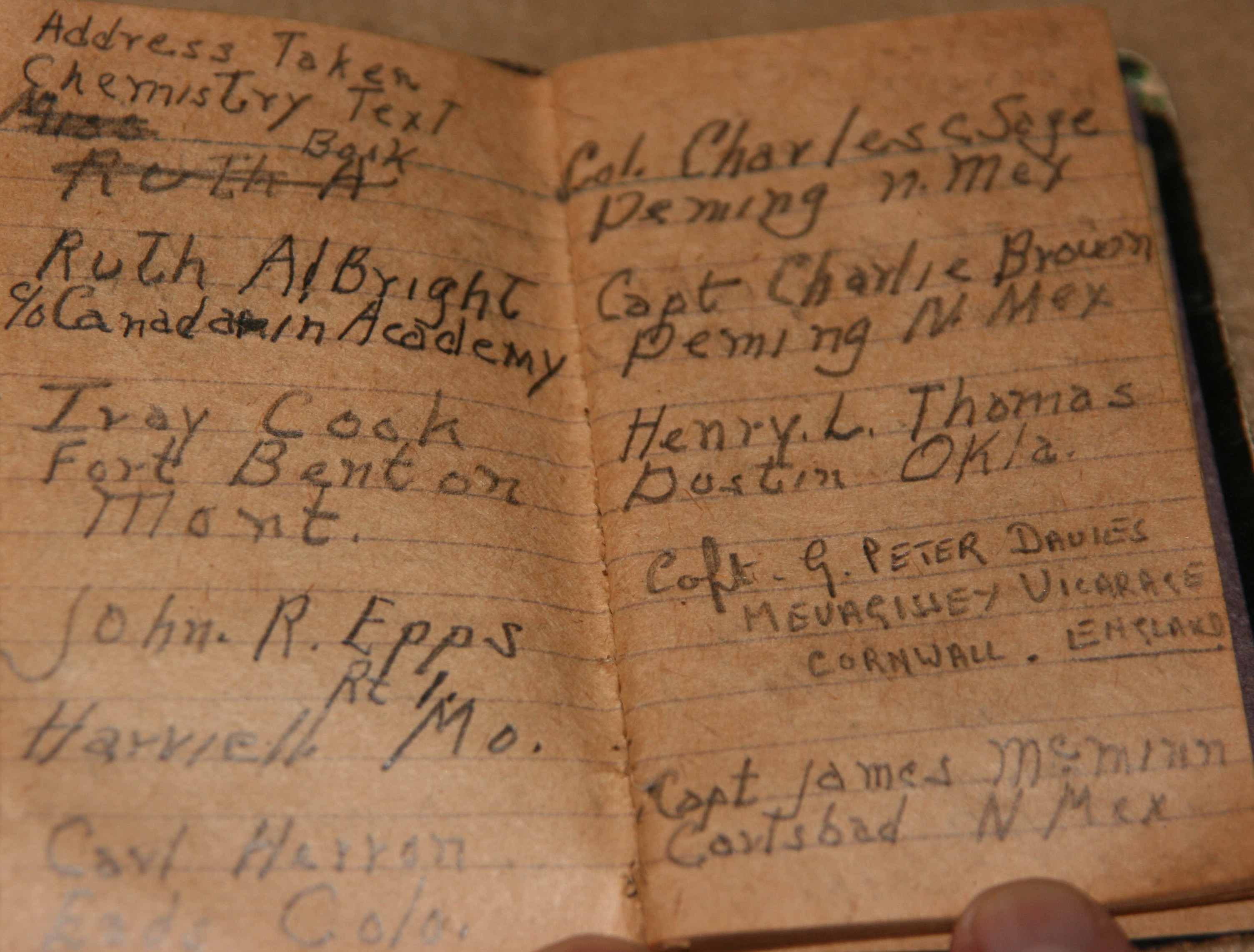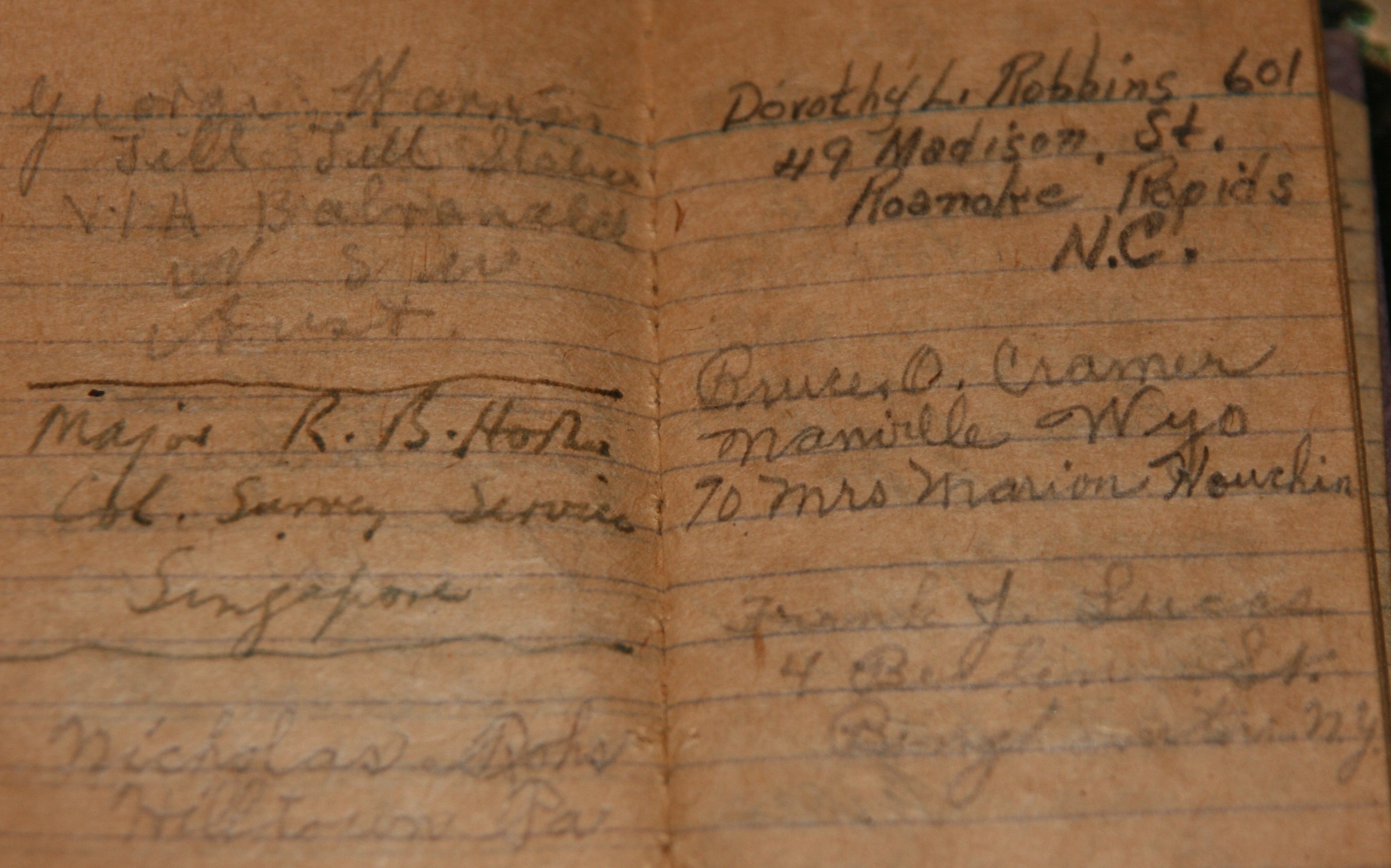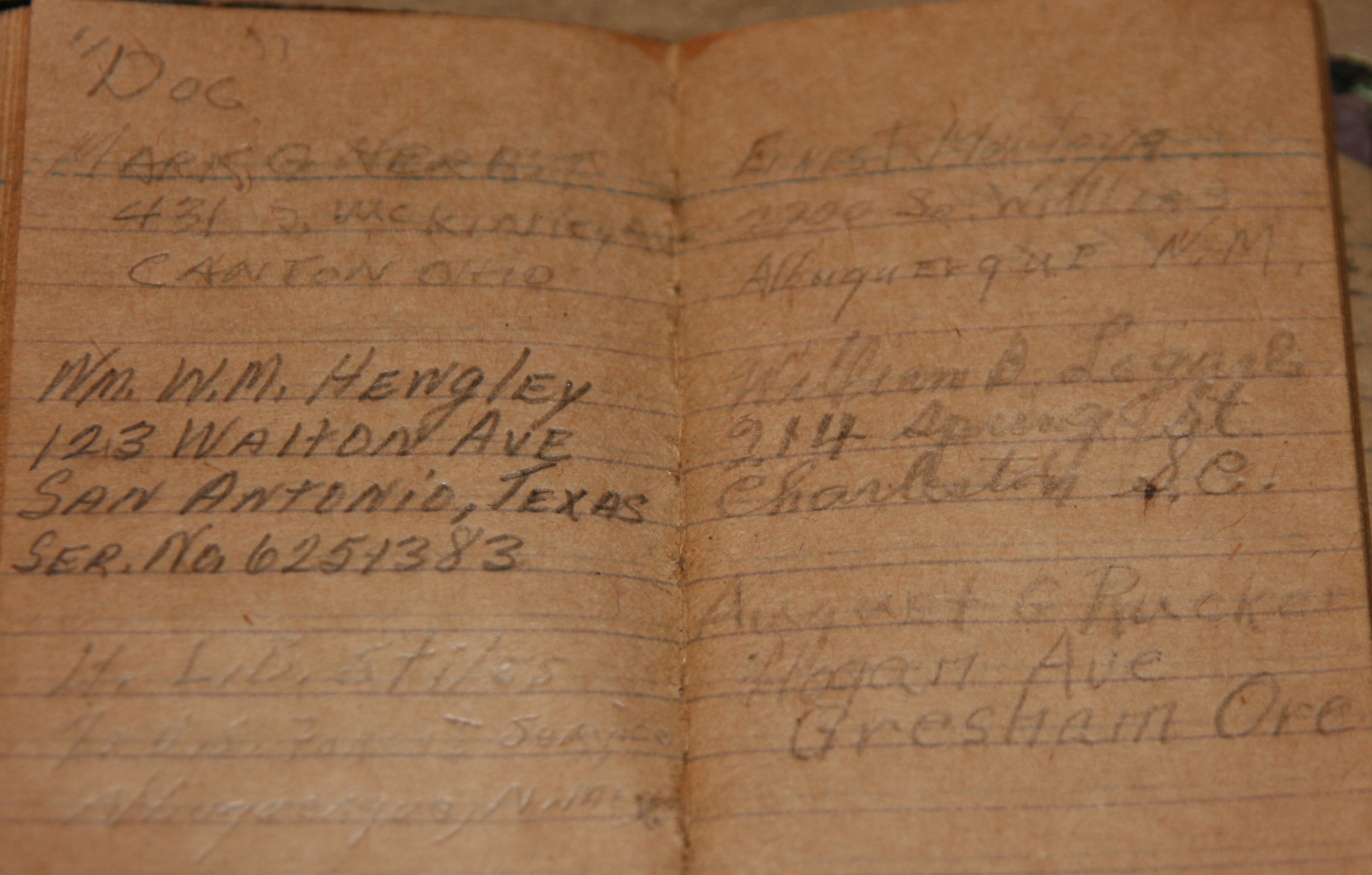 | Carl Vernon Ireton Notebook Employed by 1-6-1942 Manshu Kosku kiki kabushiki kaishi Hoten (Mukden) Mancukuo (Manchuria) Finis 8r-13-45 American Par-troops dropped 8-15-45 Sgt Carl V Ireton 958 Route 1 Box 367C Albuquerque N. Mex Mothers address Mrs Eda Ireton 1211 Avant Ave Clinton, Okla Armistice Rec By Gen Parker 8-16-45 Free - By Russians 8-20-45 Stephen D. Hutchison ? Ave Milton, Fla Jort? Fenton? Montana ? Allen Martin Fountain Colo Capt. Cash Skarda Clovis N. Mex Roy Weaver Ellesburg (Ellensburg?) Wash Herman Galloway 753 Boise Idaho Rt 5 Joseph A Burgess Rt. 1 Roanoke Texas Isaac W. Laughrun Rfd #1 (Speedy) Relief North Carolina James W Hand Fort Worth Rt 2 Box 95D Tex Ralph Middlebrook Tupelow Ark William Crebe (Grobe???) 820 Hickapoo Leavenworth Kan Address taken chemistry text book Ruth Albright c/o Canadian Academy Iray Cook Fort Benton Mont John R. Epps Rt. 1 Harviell Mo. Carl Herron Eads Colo Col. Charles Sage Deming N. Mex Capt Charlie Brown Deming N. Mex Henry L. Thomas Dustin Okal Capt(?) G. Peter Davies Meavgissey Vicarrage Cornwall, England Capt James McMinn Carlsbad N. Mex J. W. Donaldson, Capt Deming N. Mex Lt. Maynard B. Booth Ridgeview, S. Dak "Misery" James C. Cox Stockbridge Ga Leroy C. Layton Highland Ranch Star Route 2 Tomahawk, Wis "Cowboy" H.B. Greenleaf Billings, Mont Kenneth Mattern Klingerstown Penn Col. Harry M. Peck 514 W. Fruit Albuquerque Alvin A. Winnekens R.R. 1 Denmark, Wisconsin Earl Monroe Davis Boone, Colo Warren Mundell 5-11 First ave north (Wash Hillerd (Spokane) c/o Great Northern R.R. Carl M Long Mackinaw Ill RR #1 JA Scott Shell CO Perth Western Australia Air Corps CJ King 17605 Kentucky ave Detroit Mich Tel UN 24435 Floyd Marshall Russiaville Ind Ross E Newkirk R2 Box 16 Hanford, Calif Homer E. Vinger Dove Creek, Colo Jacob S Gamboa 211 Front St Salinas Calif John J. Nichols 2002 Maser Ave Dallas Tex Arnold W. Momberg Call GC Hunter San Fransisco Alvin W. Garrett Box 294 Deming NM #900 William (Bill) (Dolue) Donaldson May Idaho 935 Wesley Bendele Hondo, Texas Air Corp Weledu(?) Phillip Wayne Box 278 Railroad St Baltic Conn STEEL Iron Ores Hematite Fe2O2 Magnetite Fe3O4 Siderite FeCO3 Pyrite FeS2 653 Lewis E Loman Rt. 1 Box 109 Carlsbad NM Marcus C. Gordon Madison Ind(?) RR #4 Michael (Mitchell #1384?) Kocsis 2713 Woodbridge Cleveland Ohio Charles B. Fugazzi 628 South Limestone St Lexington Kentucky 836014 CPL(?) R. Sharpe c/o Officer Yc Records Royal Engineers Chatham Kent England G(?) Thompson 15 Higinson St Preston Lancs England H Mason 30 Hawksley St Horwich Bolton Lancs England (Dutch) Albert Burkert 803 Engrs U.S. Army A.B.O. Washington D.C. J.C. Ward (602) 1143 Steuben St Utica N.Y. Eddie Vinson Canute Okla Rt 2 Regis W. Theriac Vincennes Ind R3 S/Sgt U.S.M.C. Carl E Downing 2305 Covington Hillsboro Texas "Gus" George Gust 6231 Hillyard Spokane, Wash A. Christie 64 Arterial Rd Sneyd Green Hanley Staffs Eng ? Harrison ? VIA Balranald NSW Aust Major R.B. Hope(???) Col. Survey Service Singapore Nicholas Rohs Hilltown, PA Dorothy L. Robbins 601 49 Madison St Koanoke Rapids N.C. Bruce D. Cramer Manville Wyo c/o Mrs. Mario Houchin Frank J. Lucas 4 Berlin St Binghamton NY Ronald Joy 5 Greenmount St Beeston Leeds 11 Yorkshire England David K. Phillips Erick Oklahoma RR #1 Henry Earl Hoegerl Box 15 Violet Texas J.D. Scott 773 Leonard St Spartanburg S.C. Mark Thompson 37 Mikasa Street Walney Island Barrow-in-Furness Lancashire, England Joesph A. Vater 1462 Steuben St Pittlsburgh, Pa T.E. Aronds 2nd Lieutenant War Department Bandoeng Java Dutch East Indies Roy E. Creceey (Creecey?) Willow Creek Mont Lt. H.E. Wad 12 Clonbrock Stoke Newington London N16 England Walter S. Hurley 1st Sgt U.S. Army "Doc" Mark G. Herbst 431 S. McKinley Canton, Ohio Wm. W.M. Hewgley 123 Walton Ave San Antonio, Texas Ser. No. 6251383 Lt. L.B. Stiles c/o U.S. Forest Service Albuquerque N. Mex Ernest Montoya 2700 So. Williams Albuquerque N. Mex William B. Lagare 214 Spring St. Charleston S.C. August G. Rucker Hogan Ave Gresham Ore Dick Nunn Hillsboro, N. Mex Mrs. Roy Wilkens sister Allen Wright Sulpher Okla |