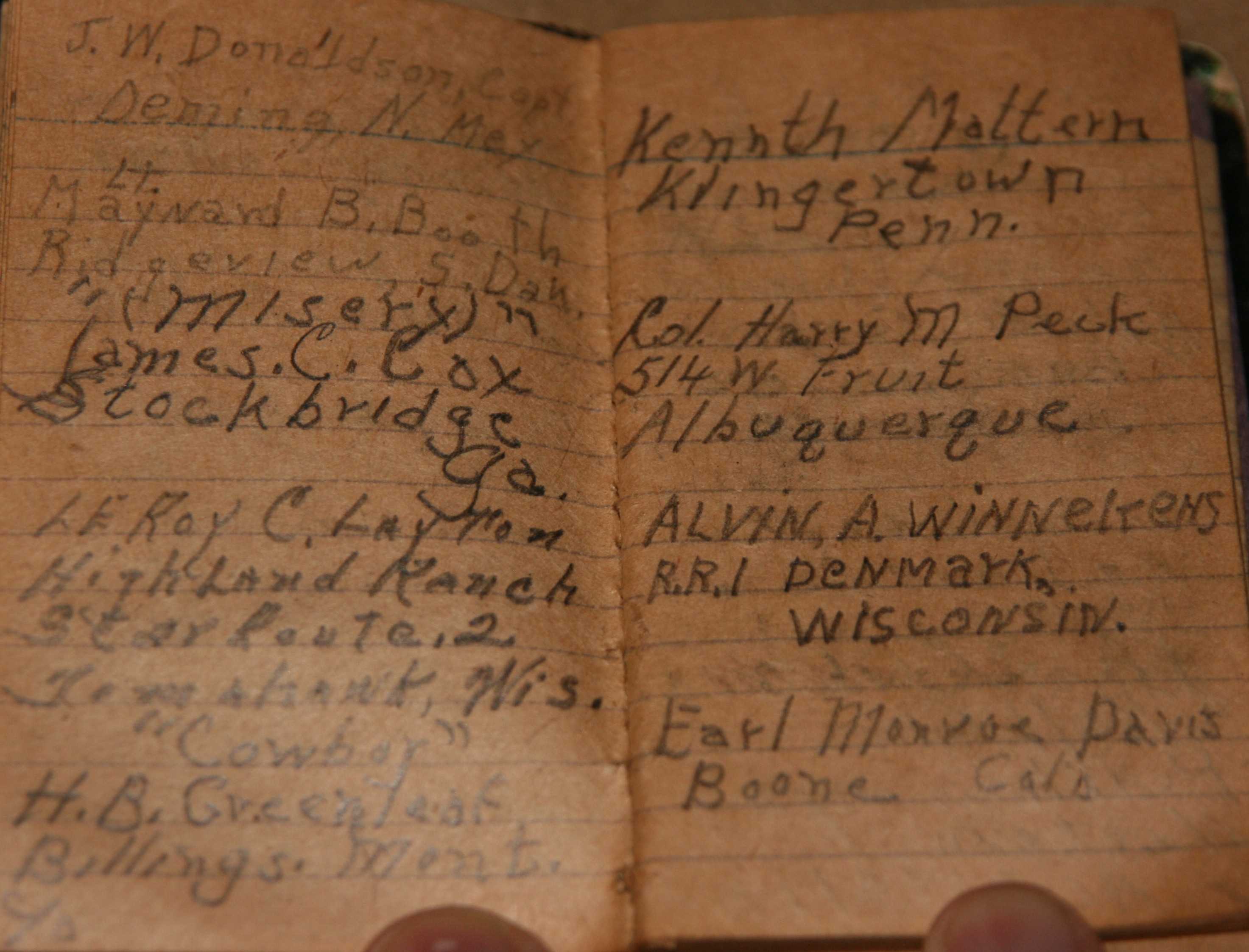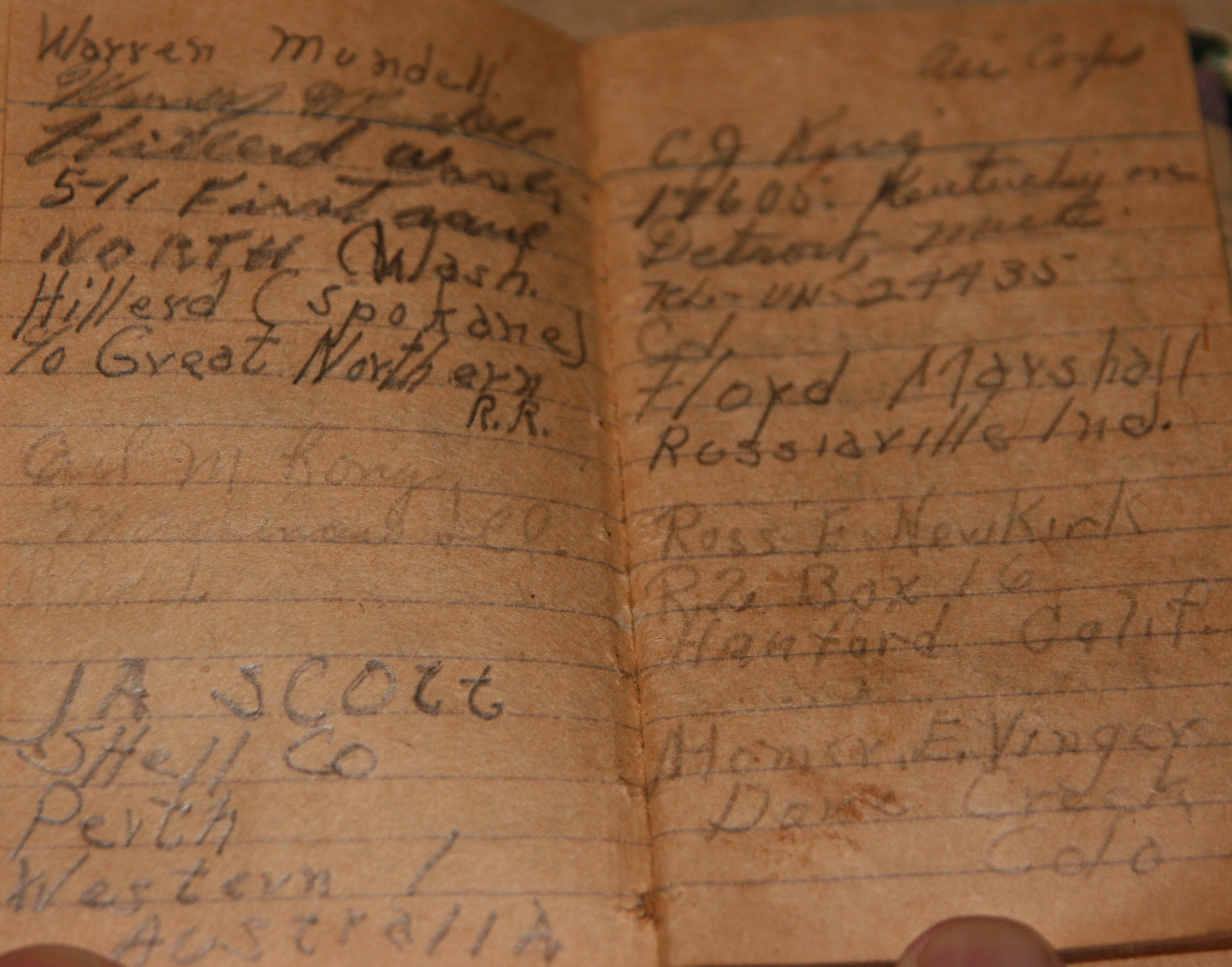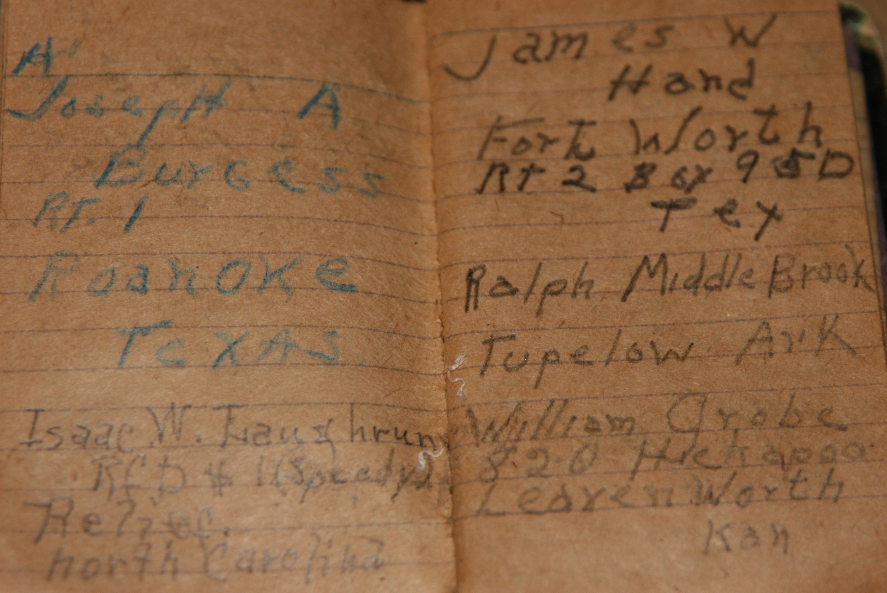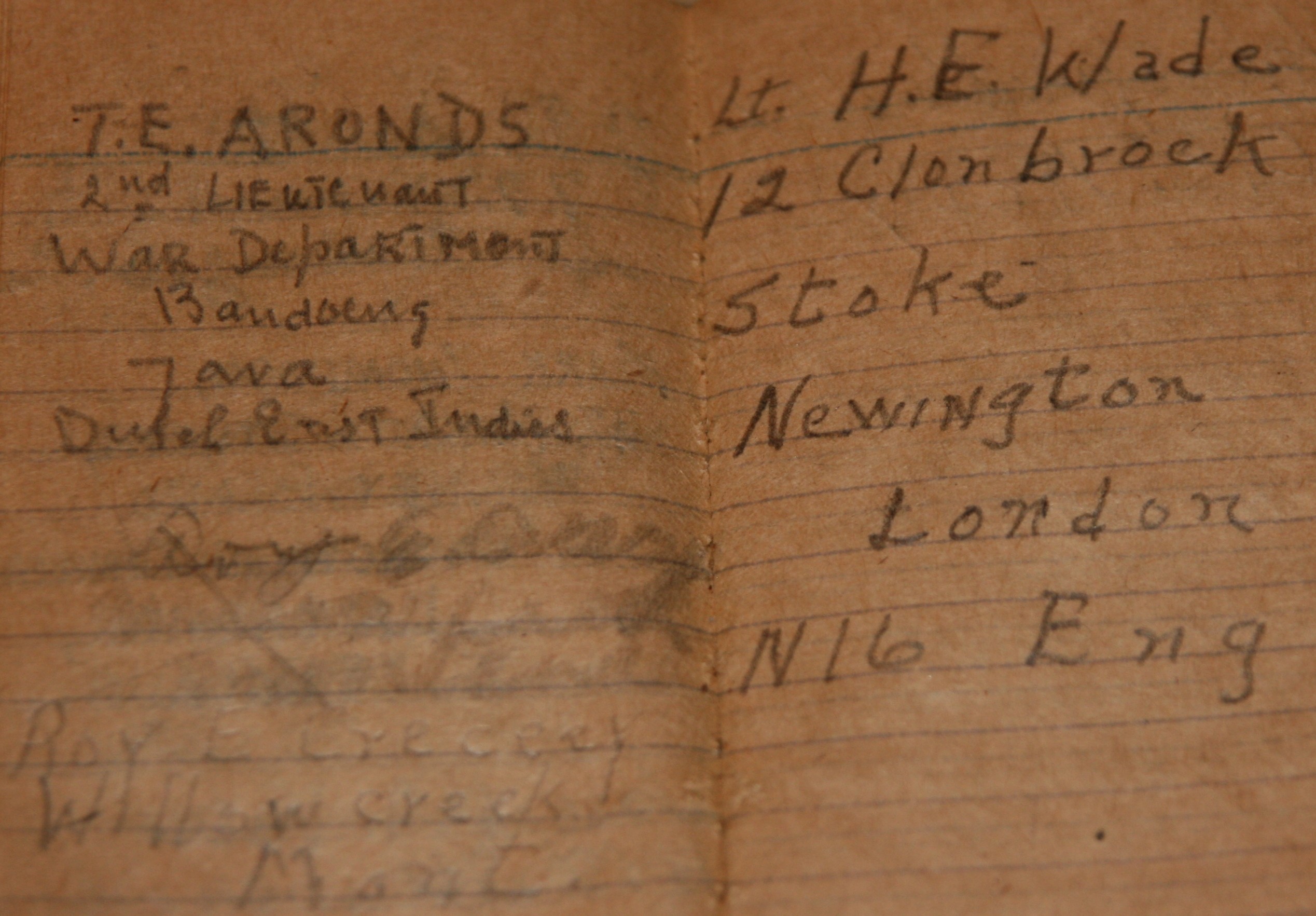 | Carl Vernon Ireton Notebook Employed by 1-6-1942 Manshu Kosku kiki kabushiki kaishi Hoten (Mukden) Mancukuo (Manchuria) Finis 8r-13-45 American Par-troops dropped 8-15-45 Sgt Carl V Ireton 958 Route 1 Box 367C Albuquerque N. Mex Mothers address Mrs Eda Ireton 1211 Avant Ave Clinton, Okla Armistice Rec By Gen Parker 8-16-45 Free - By Russians 8-20-45 Stephen D. Hutchison ? Ave Milton, Fla Jort? Fenton? Montana ? Allen Martin Fountain Colo Capt. Cash Skarda Clovis N. Mex Roy Weaver Ellesburg (Ellensburg?) Wash Herman Galloway 753 Boise Idaho Rt 5 Joseph A Burgess Rt. 1 Roanoke Texas Isaac W. Laughrun Rfd #1 (Speedy) Relief North Carolina James W Hand Fort Worth Rt 2 Box 95D Tex Ralph Middlebrook Tupelow Ark William Crebe (Grobe???) 820 Hickapoo Leavenworth Kan Address taken chemistry text book Ruth Albright c/o Canadian Academy Iray Cook Fort Benton Mont John R. Epps Rt. 1 Harviell Mo. Carl Herron Eads Colo Col. Charles Sage Deming N. Mex Capt Charlie Brown Deming N. Mex Henry L. Thomas Dustin Okal Capt(?) G. Peter Davies Meavgissey Vicarrage Cornwall, England Capt James McMinn Carlsbad N. Mex J. W. Donaldson, Capt Deming N. Mex Lt. Maynard B. Booth Ridgeview, S. Dak "Misery" James C. Cox Stockbridge Ga Leroy C. Layton Highland Ranch Star Route 2 Tomahawk, Wis "Cowboy" H.B. Greenleaf Billings, Mont Kenneth Mattern Klingerstown Penn Col. Harry M. Peck 514 W. Fruit Albuquerque Alvin A. Winnekens R.R. 1 Denmark, Wisconsin Earl Monroe Davis Boone, Colo Warren Mundell 5-11 First ave north (Wash Hillerd (Spokane) c/o Great Northern R.R. Carl M Long Mackinaw Ill RR #1 JA Scott Shell CO Perth Western Australia Air Corps CJ King 17605 Kentucky ave Detroit Mich Tel UN 24435 Floyd Marshall Russiaville Ind Ross E Newkirk R2 Box 16 Hanford, Calif Homer E. Vinger Dove Creek, Colo Jacob S Gamboa 211 Front St Salinas Calif John J. Nichols 2002 Maser Ave Dallas Tex Arnold W. Momberg Call GC Hunter San Fransisco Alvin W. Garrett Box 294 Deming NM #900 William (Bill) (Dolue) Donaldson May Idaho 935 Wesley Bendele Hondo, Texas Air Corp Weledu(?) Phillip Wayne Box 278 Railroad St Baltic Conn STEEL Iron Ores Hematite Fe2O2 Magnetite Fe3O4 Siderite FeCO3 Pyrite FeS2 653 Lewis E Loman Rt. 1 Box 109 Carlsbad NM Marcus C. Gordon Madison Ind(?) RR #4 Michael (Mitchell #1384?) Kocsis 2713 Woodbridge Cleveland Ohio Charles B. Fugazzi 628 South Limestone St Lexington Kentucky 836014 CPL(?) R. Sharpe c/o Officer Yc Records Royal Engineers Chatham Kent England G(?) Thompson 15 Higinson St Preston Lancs England H Mason 30 Hawksley St Horwich Bolton Lancs England (Dutch) Albert Burkert 803 Engrs U.S. Army A.B.O. Washington D.C. J.C. Ward (602) 1143 Steuben St Utica N.Y. Eddie Vinson Canute Okla Rt 2 Regis W. Theriac Vincennes Ind R3 S/Sgt U.S.M.C. Carl E Downing 2305 Covington Hillsboro Texas "Gus" George Gust 6231 Hillyard Spokane, Wash A. Christie 64 Arterial Rd Sneyd Green Hanley Staffs Eng ? Harrison ? VIA Balranald NSW Aust Major R.B. Hope(???) Col. Survey Service Singapore Nicholas Rohs Hilltown, PA Dorothy L. Robbins 601 49 Madison St Koanoke Rapids N.C. Bruce D. Cramer Manville Wyo c/o Mrs. Mario Houchin Frank J. Lucas 4 Berlin St Binghamton NY Ronald Joy 5 Greenmount St Beeston Leeds 11 Yorkshire England David K. Phillips Erick Oklahoma RR #1 Henry Earl Hoegerl Box 15 Violet Texas J.D. Scott 773 Leonard St Spartanburg S.C. Mark Thompson 37 Mikasa Street Walney Island Barrow-in-Furness Lancashire, England Joesph A. Vater 1462 Steuben St Pittlsburgh, Pa T.E. Aronds 2nd Lieutenant War Department Bandoeng Java Dutch East Indies Roy E. Creceey (Creecey?) Willow Creek Mont Lt. H.E. Wad 12 Clonbrock Stoke Newington London N16 England Walter S. Hurley 1st Sgt U.S. Army "Doc" Mark G. Herbst 431 S. McKinley Canton, Ohio Wm. W.M. Hewgley 123 Walton Ave San Antonio, Texas Ser. No. 6251383 Lt. L.B. Stiles c/o U.S. Forest Service Albuquerque N. Mex Ernest Montoya 2700 So. Williams Albuquerque N. Mex William B. Lagare 214 Spring St. Charleston S.C. August G. Rucker Hogan Ave Gresham Ore Dick Nunn Hillsboro, N. Mex Mrs. Roy Wilkens sister Allen Wright Sulpher Okla |