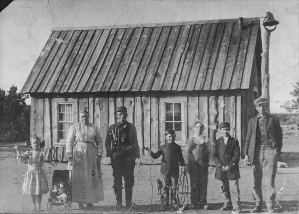 Top (left to right): Jim, Rolla, Frank Ireton their father, Uncle John Burr and wife Mattie (Frank’s sister), Winn, to his side is Corie and in front of him is his wife Virie with Walter sitting on her lap, other girls are Annie and Jessie.Bottom: Elic, Elmer, Henry, and Carl Ireton on his mother’s lap Eda Ireton. Young girl is Faye Burr, in chair is Grandmother Eunice Ireton, Frank’s mother. Taken at Frank Ireton’s homestead 1 South 1 1/2 West Putnam, OK (note says house is 12’x30’ plus shed room) |
