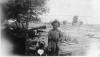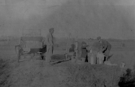 Frank Austin, Carl Vernon, and Rolla Chester Ireton filling milk bottles. R.C.’s first car on left. |