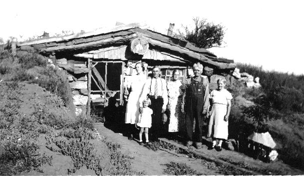 Storm dugout of Jim Foust. Back: Nancie Foust, J.W. Foust (brother of Jim Foust), Alice Foust, Jim Foust, Ollie Foust, Front: LuAlice Foust |