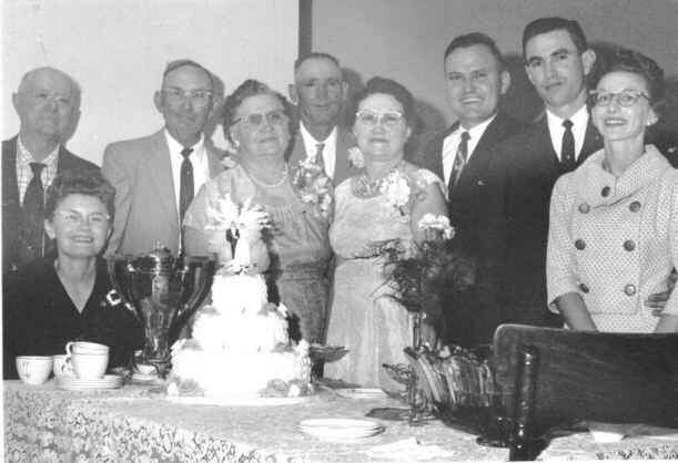50th Anniversary: unknown (Austin?), Larene, R.C., Lillie, James Gregory, Elva (Ireton) Gregory, M. Frank, Charles, JoAnne |