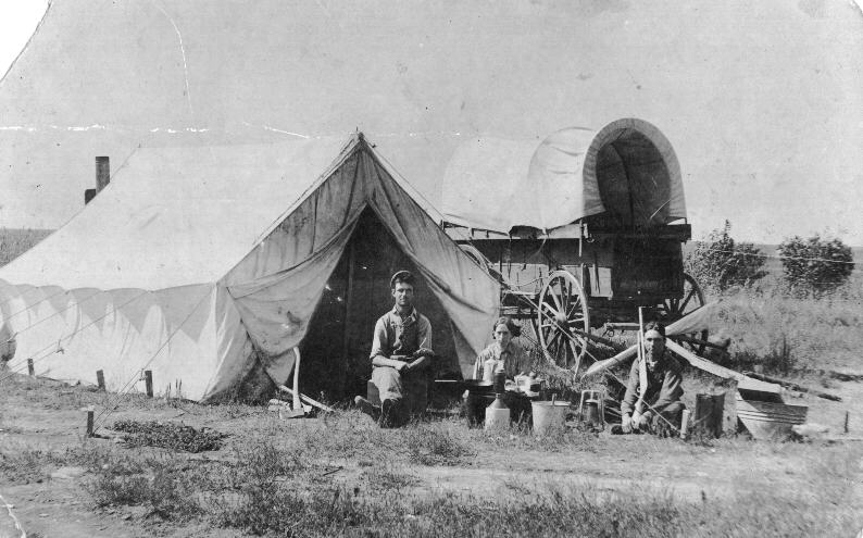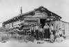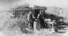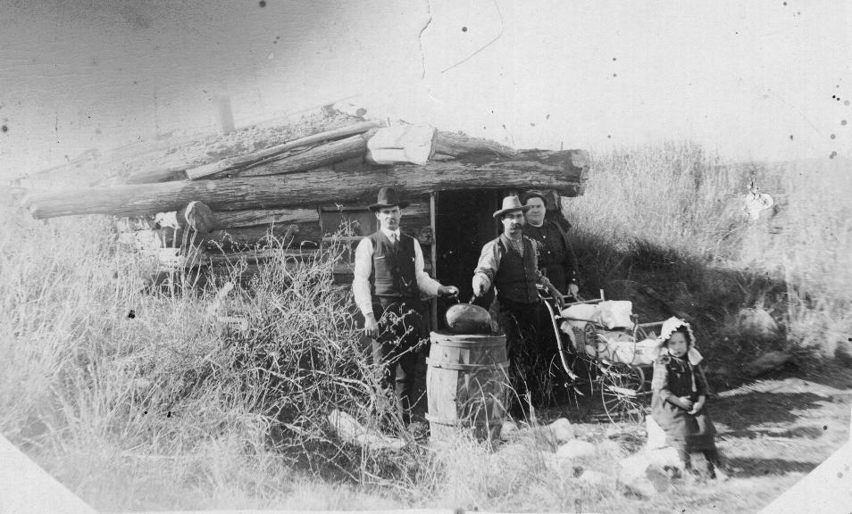 Charlie Brown’s homestead dugout: Charlie (Eda Ireton’s brother), Arther, and Eda and unidentified child. Appear to be cutting watermelon |