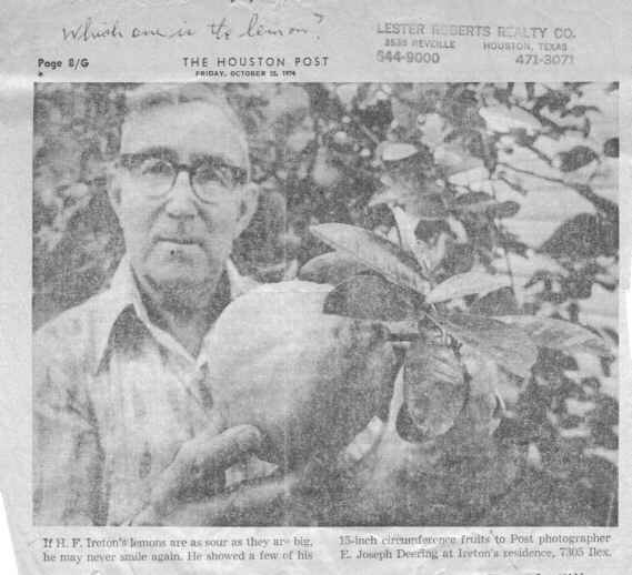 Newspaper clipping of Henry (H.F.) Ireton and huge lemon, with typical humorous Ireton handwritten comment |