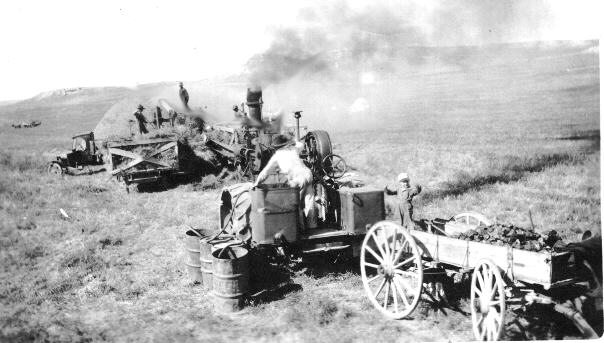 Frank A.’s threshing equipment, coal wagon in foreground